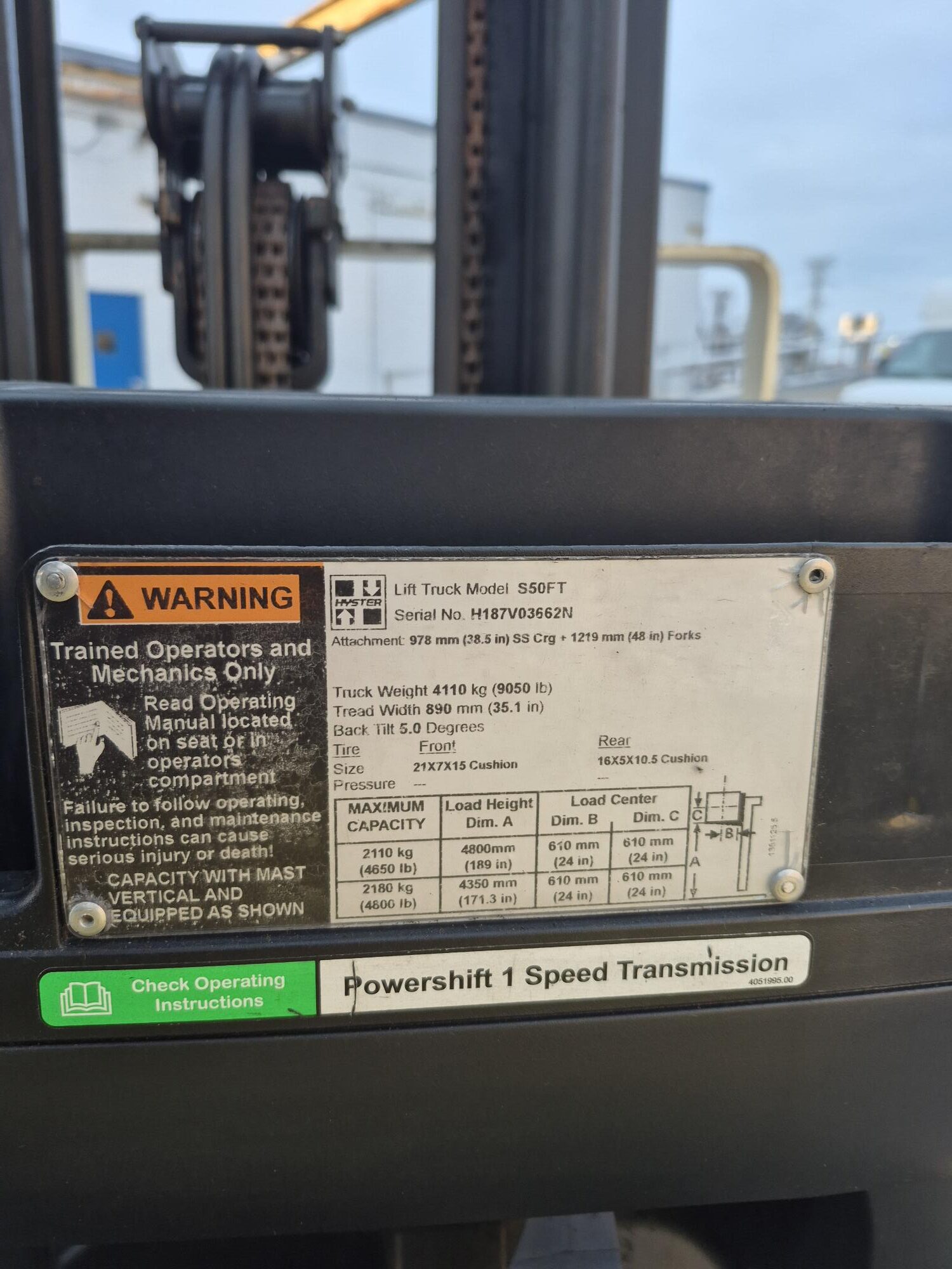 - Lift Height (LH): 187″ (forks)